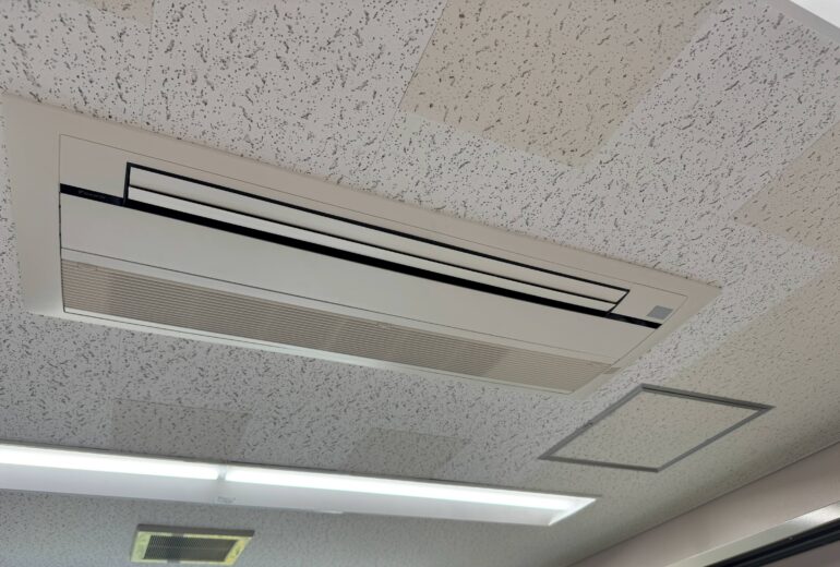 GRIT株式会社の下山です。本日は長野県岡谷市の金属加工工場での空調工事現場のレポートです。こちらの工場のオフィスエリアに設置された天井カセット型エアコンが経年による故障のため使用不能となり更新工事を行うことになりました。更新対象はマルチで室外機1台に室内機4台の組合わせです。