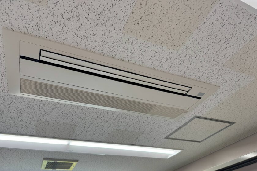 GRIT株式会社の下山です。本日は新潟県新潟市での空調工事現場のレポートです。こちら公共教育施設では、暖房は温水ファンコイルで、冷房は壁付エアコンと、冷暖別々での空調設備にて運用されていましたが、今回の更新工事で温水ファンコイルと壁付けエアコンを撤去し、新たに1方向吹き出しの天井カセット型エアコンを設置することになりました。更新対象は25部屋となります。